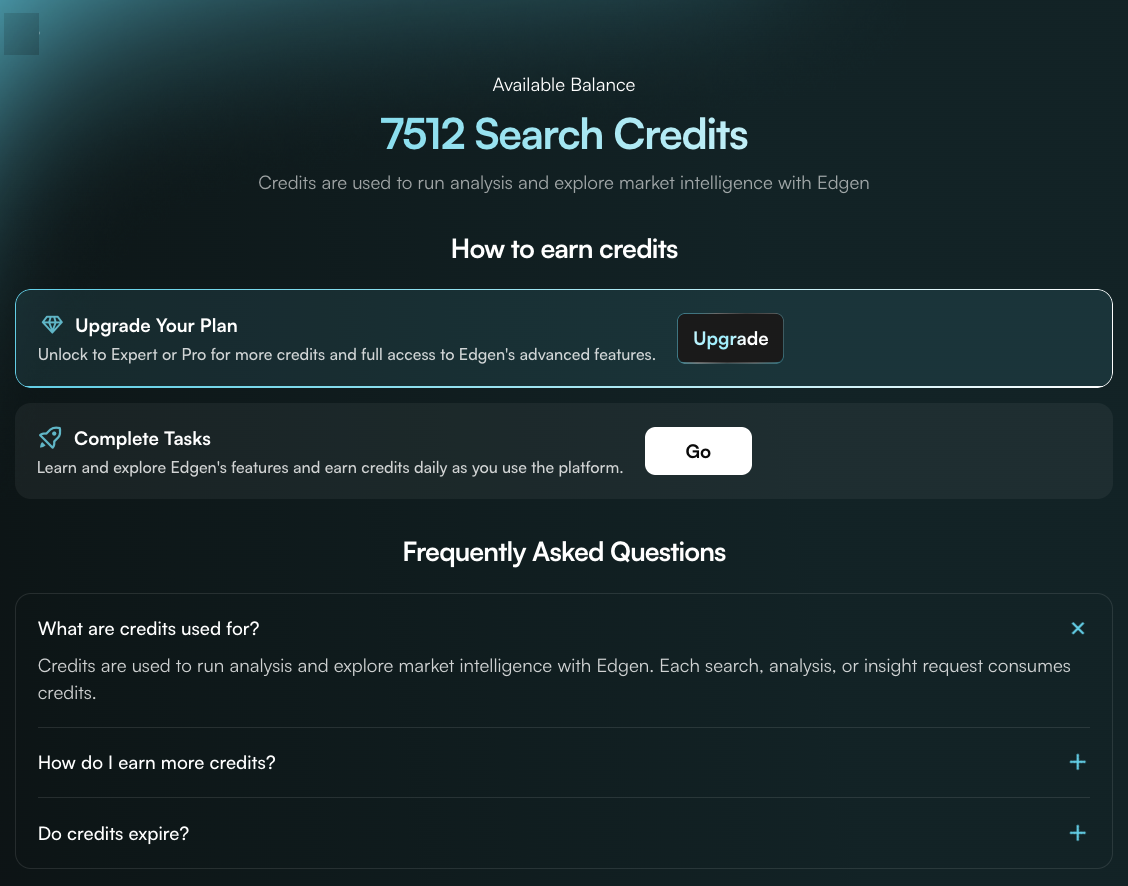 - Credits power Edgen's AI features — market intelligence, reports, alerts.