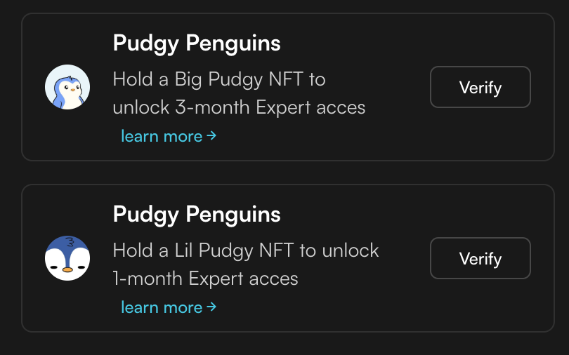 - Partner: limited-time collabs with projects like Nansen, Pudgy Penguins, and more