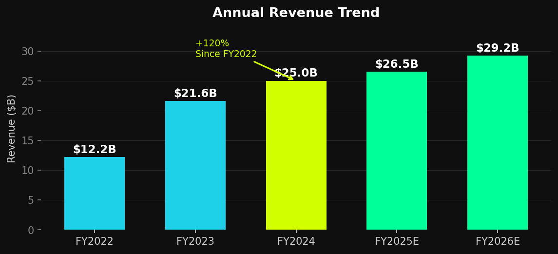 Total Revenue ($B) | 12.2 | 21.6 | 25.0 | ~26.5 | ~29.2 |