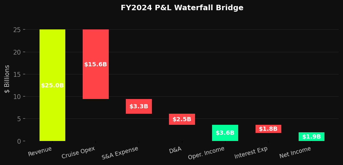 The FY2024 P&L demonstrates Carnival's improved — but still-improving — cost structure. $25.0B of revenue translates to $3.6B of operating income (14.4% margin). The key remaining drag on net income is $1.8B of net interest expense, a figure management is systematically reducing through aggressive deleveraging. Every dollar of debt retired converts directly to incremental net income and free cash flow. With interest expense projected to fall over $700M from peak by 2026, the income statement leverage is powerful.