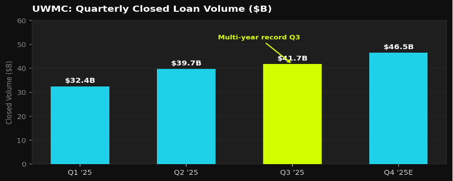 UWMC's core operational metrics are exceptionally strong. The company posted record-high Q3 2025 origination volume of $41.7B — its highest level since 2021. Revenue of $843.3M grew 13.1% YoY. GOS margins expanded sequentially through all three reported quarters of 2025, from 94 bps in Q1 to 130 bps in Q3. Q4 guidance of $43–$50B in volume and 105–130 bps margins signals continued momentum. Key caveat: GAAP earnings remain distorted by non-cash MSR fair value swings.