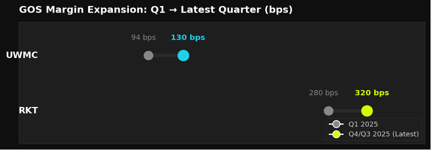 The gain-on-sale margin is the single most revealing metric in this comparison. RKT's 3.20% in Q4 2025 is more than 2.4× UWMC's 1.30% in Q3 2025. This gap reflects the structural difference in their business models: RKT's direct-to-consumer brand commands a pricing premium, while UWMC's wholesale model competes primarily on price efficiency. The trajectory matters too — both companies are expanding margins, but RKT is expanding from a significantly higher base.