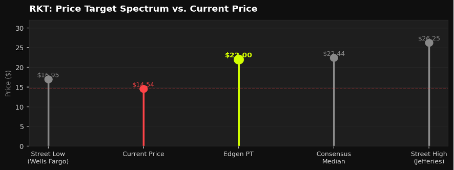 RKT's Q4 2025 earnings beat triggered a flurry of upward price target revisions. The consensus has strengthened to 8 Buy / 11 Hold / 0 Sell among 19 analysts. The stock's -39% decline from its $24.36 January 2026 peak has created a significant dislocation between analyst conviction and market price. Our $22.00 PT aligns with the consensus median and implies 51% upside.
