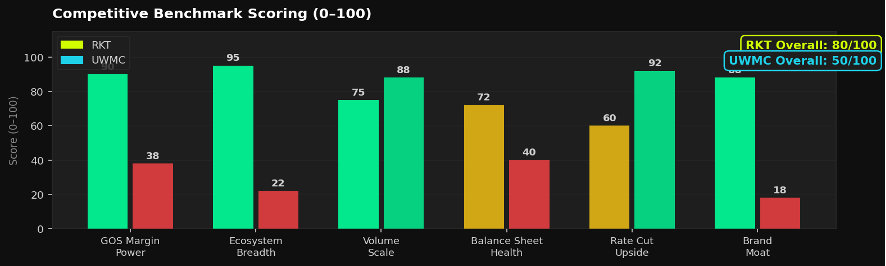 Both companies are powerful within their chosen strategies, but across the six dimensions that define long-term competitive durability, RKT holds a decisive edge. UWMC scores highest on volume scale and rate sensitivity — the two factors that matter most in a rate-cut environment. RKT dominates on ecosystem breadth, consumer brand, balance sheet health, and GOS margin pricing power.