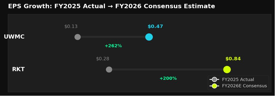 Analyst consensus projects explosive EPS growth for both companies in 2026, driven by cyclical recovery assumptions. RKT's growth story is compounded by its structural synergy narrative — $400M+ in guided Mr. Cooper cost synergies on top of an improving rate environment. UWMC's EPS growth is almost entirely macro-dependent: it represents pure operating leverage into a rate-cut cycle.