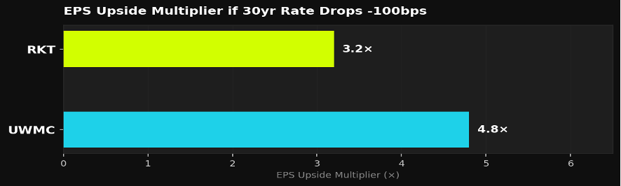 A sustained -100 bps decline in the 30-year fixed rate is the most powerful single macro catalyst for both names. UWMC has materially higher sensitivity given its pure-play origination focus and extreme operating leverage. However, RKT's massive $2.1T servicing portfolio means rate cuts also unlock a high-margin refinancing recapture engine — the "Rocket Flywheel" — which provides a second, higher-quality lever.