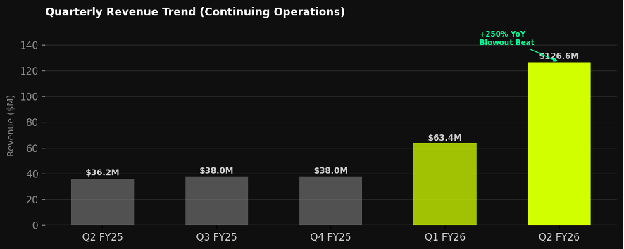 2026財年第二季度(截至2025年11月30日)是一個決定性時刻:總營收飆升至$1.266億,同比增長250%,超出市場普遍預期$8670萬的46%。HPC託管貢獻了$8500萬,數據中心託管貢獻了$4160萬(同比增長15%)。