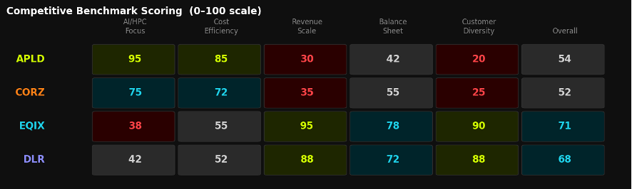APLD 業務橫跨傳統數據中心REIT和下一代AI雲基礎設施。其最接近的競爭對手是Core Scientific (CORZ),該公司也已從加密貨幣轉向AI託管。Equinix (EQIX) 和 Digital Realty (DLR) 等老牌企業在規模和地理多樣性方面具有競爭力,但缺乏APLD的HPC原生設計優勢。